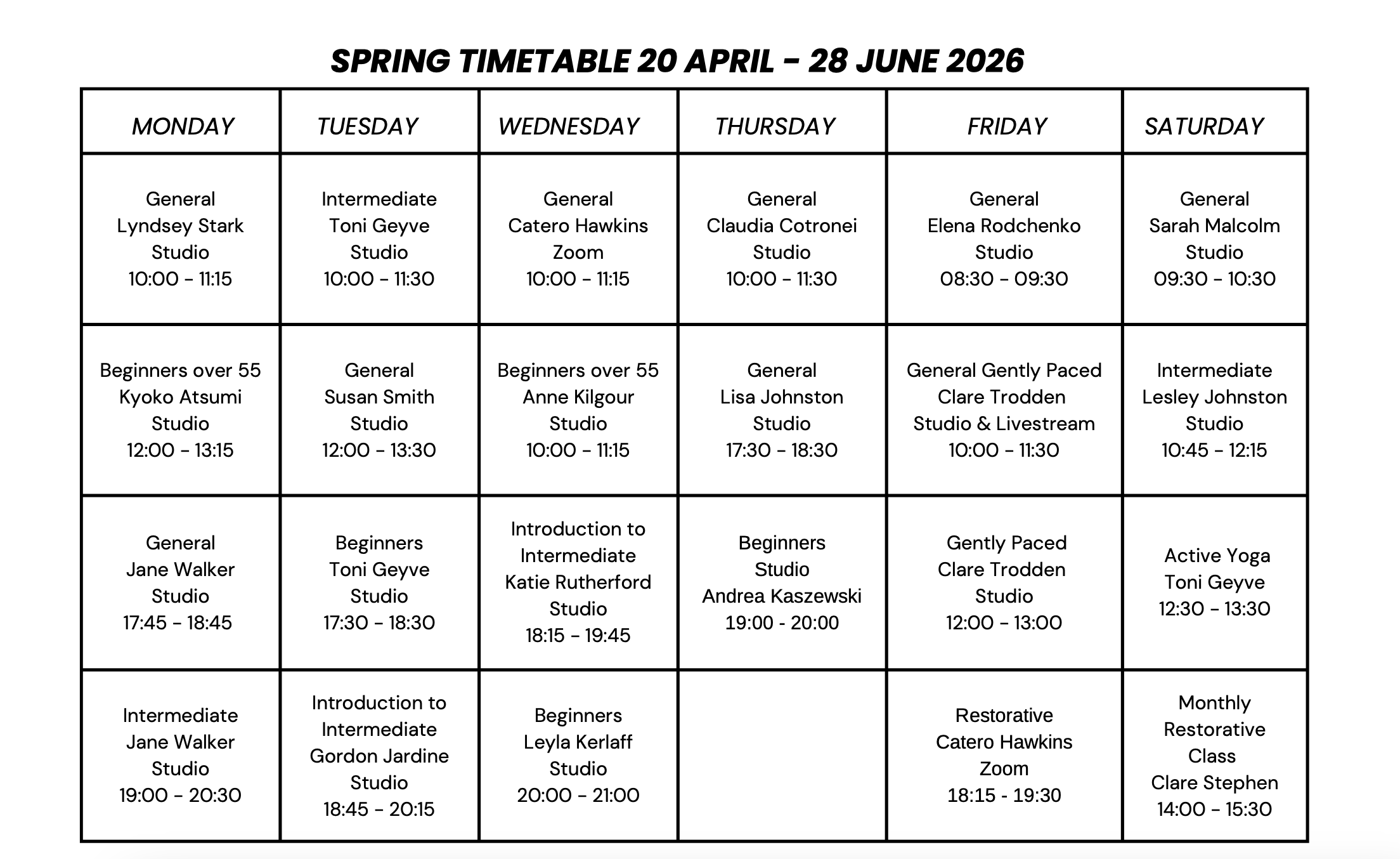 We follow the methods of BKS Iyengar, world renowned yoga master. His methods are safe, precise and suitable for every age and condition. We’ve been here for more than 40 years and our Centre has classes for absolute beginners to more advanced students. There are classes 6 days of the week and we provide all the equipment you need.